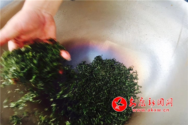 活動(dòng)現(xiàn)場(chǎng),三口電炒鍋一字排開,三位炒茶師傅雙手翻飛,嫩綠的鮮葉在他們手中滾動(dòng)擠壓,揉捻、殺青、焙烘......最終成為我們常見(jiàn)的毛尖茶葉。