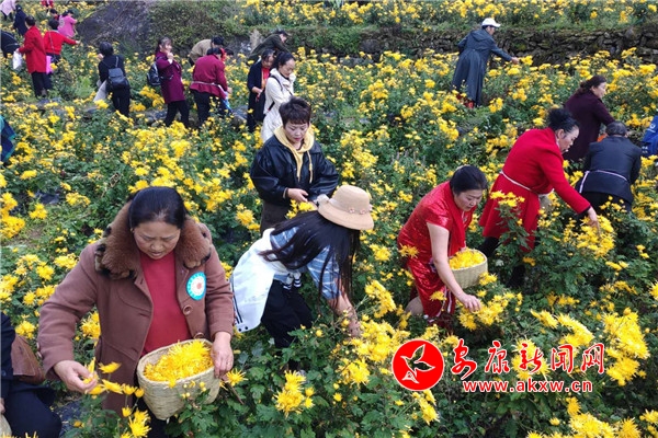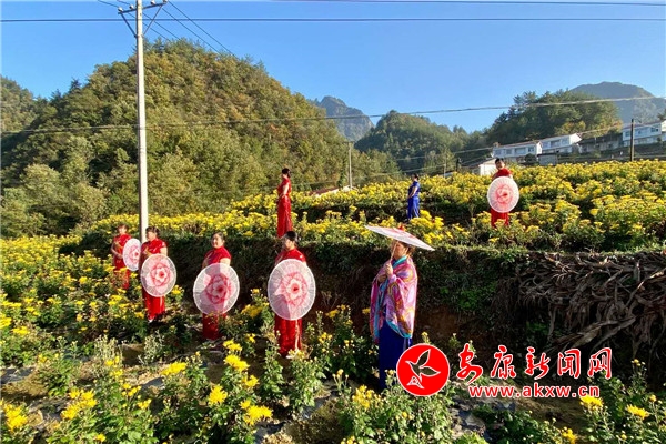 另一邊,百畝金絲黃菊爭(zhēng)相盛放,甚是好看。大家繞著山路健步而行。菊花種植基地里,游客們被花海吸引著,一邊賞花、采摘,一邊不由自主地踏入花海拍照。wKY安康新聞網(wǎng)