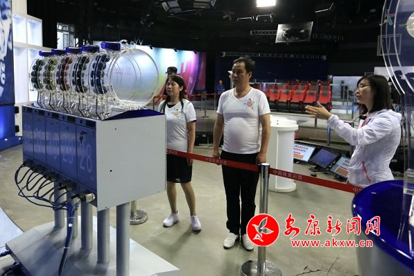 19時(shí),安康觀摩團(tuán)在工作人員的指導(dǎo)下,進(jìn)行了嚴(yán)格有序的安檢工作。每個(gè)人都需要將隨身所帶物品全部放入存儲(chǔ)柜。所有人員安檢結(jié)束后,通過專用通道,憑實(shí)名認(rèn)證的通行證進(jìn)入開獎(jiǎng)直播大廳。待大家整齊落座開獎(jiǎng)直播大廳后,工作人員再次講解注意事項(xiàng),并邀請(qǐng)觀摩團(tuán)收看了開獎(jiǎng)場地介紹、開獎(jiǎng)流程、數(shù)據(jù)封存及搖獎(jiǎng)設(shè)備四個(gè)短視頻。工作人員還將試機(jī)球發(fā)給觀摩團(tuán)成員,讓大家真實(shí)感受搖獎(jiǎng)球的質(zhì)地,四名幸運(yùn)站長被邀請(qǐng)到臺(tái)上零距離參觀搖獎(jiǎng)設(shè)備。