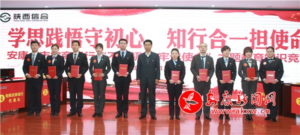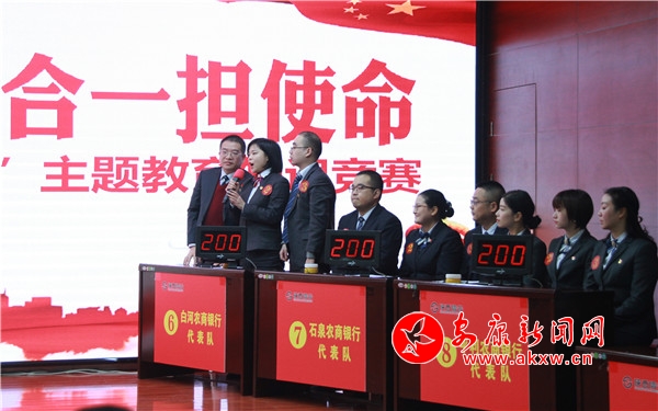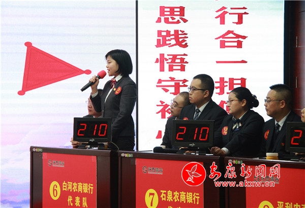 據(jù)了解,本次活動(dòng)以“學(xué)思踐悟守初心,知行合一擔(dān)使命”為主題,以習(xí)近平新時(shí)代中國(guó)特色社會(huì)主義思想、黨的十九屆四中全會(huì)精神、黨章黨規(guī)、掃黑除惡專(zhuān)項(xiàng)斗爭(zhēng)應(yīng)知應(yīng)會(huì)知識(shí)等為競(jìng)賽內(nèi)容,設(shè)置必答、搶答、風(fēng)險(xiǎn)、加試等環(huán)節(jié)進(jìn)行,來(lái)自安康各縣區(qū)農(nóng)商行10個(gè)代表隊(duì),共30名選手參與競(jìng)答。賽場(chǎng)上,氛圍緊張激烈,你追我趕,尤其在搶答題環(huán)節(jié),搶答令一經(jīng)發(fā)出,各隊(duì)選手立即開(kāi)始爭(zhēng)相搶拍競(jìng)答器,比分稍微落后的隊(duì)伍在搶到答題權(quán)后,出色作答后贏得現(xiàn)場(chǎng)陣陣掌聲,即使答錯(cuò),選手們也毫不氣餒,互相鼓勵(lì),立即調(diào)整狀態(tài)準(zhǔn)備下一次搶答。比賽現(xiàn)場(chǎng)精彩紛呈,觀(guān)眾不時(shí)為選手們精準(zhǔn)的回答報(bào)以熱烈的掌聲。