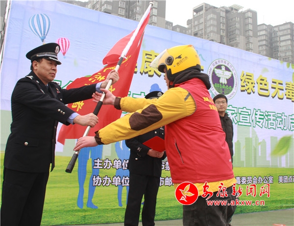 漢濱區(qū)禁毒志愿者,郵政管理局快遞騎手,美團(tuán)點(diǎn)評公司送餐騎手共同組成宣傳志愿者方隊(duì)。