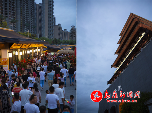 6月28日晚,夜色漸臨,漢江邊上,西城閣旁,古西城文化園(西城坊)游人如織。人們?nèi)宄扇,或乘涼游玩,或聚餐暢談,一派繁華熱鬧景象。(記者 張世虎 攝) Bw3安康新聞網(wǎng)