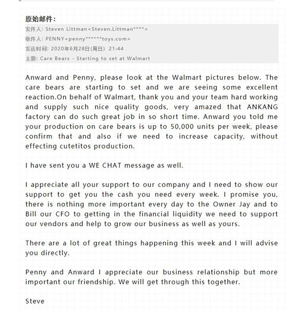近日,陜西安貝斯玩具科創(chuàng)有限公司董事長沈愛華收到一封來自海外的感謝信。來信者是安貝斯的美國客人,沃爾瑪集團的副總裁Steven先生。