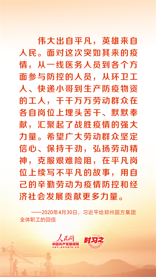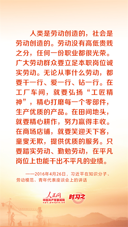 人民創(chuàng)造歷史,勞動(dòng)開(kāi)創(chuàng)未來(lái)。黨的十八大以來(lái),習(xí)近平總書(shū)記始終心系全國(guó)廣大勞動(dòng)者,激勵(lì)廣大勞動(dòng)者在平凡崗位上續(xù)寫(xiě)不平凡的故事。在“五一”國(guó)際勞動(dòng)節(jié)到來(lái)之際,讓我們重溫總書(shū)記的諄諄話(huà)語(yǔ),用辛勤勞動(dòng)為經(jīng)濟(jì)社會(huì)發(fā)展貢獻(xiàn)力量。