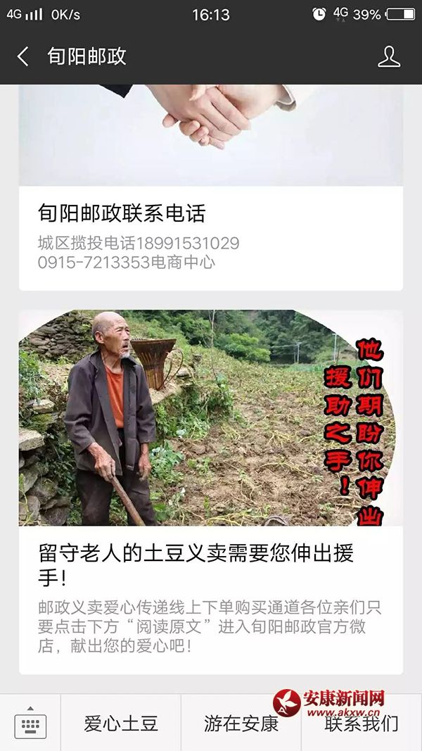 一是關(guān)注旬陽郵政微信公眾號,點(diǎn)擊右下角的“愛心土豆”鏈接,進(jìn)入旬陽郵政官方微店直接購買;