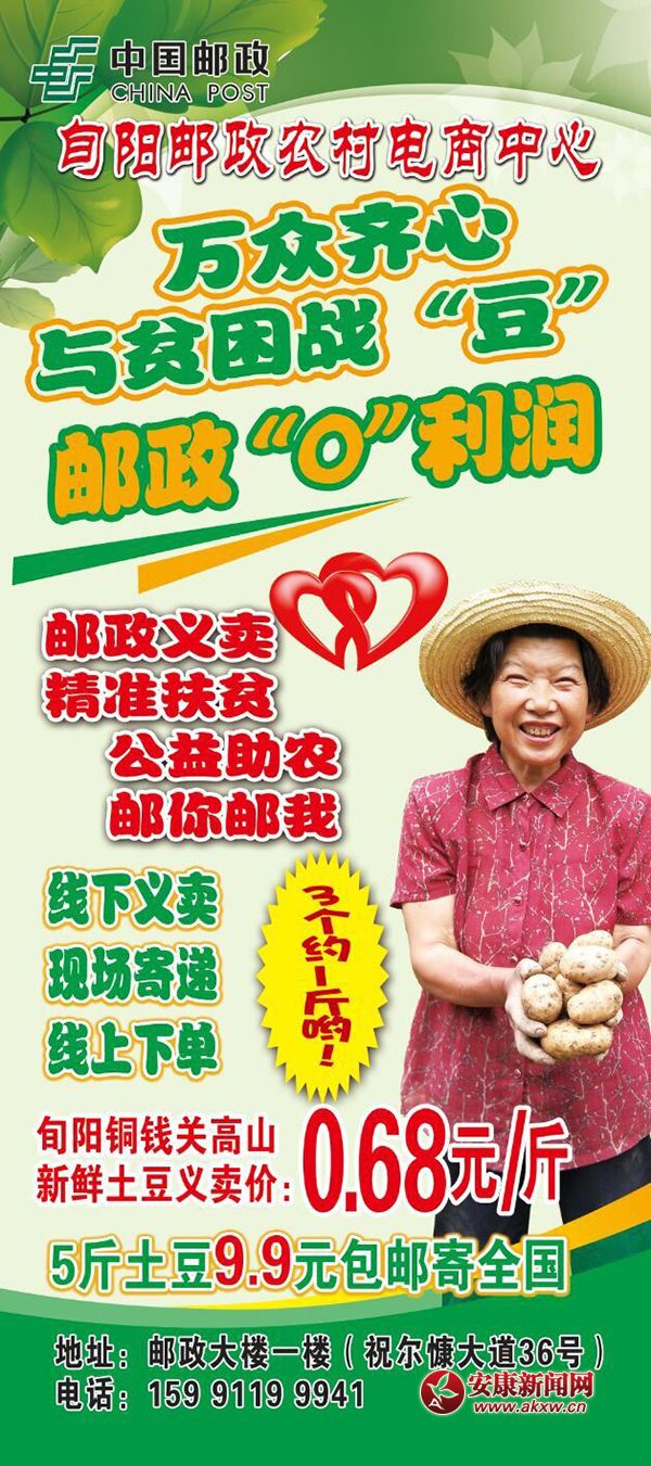 現(xiàn)在,旬陽郵政科學(xué)合理的解決供給矛盾:經(jīng)過實(shí)地考察后,為解決農(nóng)民銷路難題,積極響應(yīng)縣委、縣政府“打贏脫貧攻堅(jiān)戰(zhàn)”的號召,第一時(shí)間利用行業(yè)優(yōu)勢,通過“愛心義賣+愛心寄遞+線上訂單”活動(dòng)的方式將滯銷的土豆銷出去。