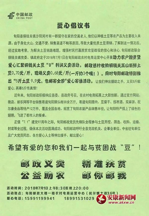進(jìn)村高價(jià)回收、線下低價(jià)義賣:旬陽郵政公司已經(jīng)與銅錢關(guān)鎮(zhèn)黨委、鎮(zhèn)政府對接聯(lián)合,赴沙陽河村收購高山新鮮土豆0.70元/斤,現(xiàn)場義賣0.68元/斤。對,你沒有看錯(cuò),真正的高價(jià)收購,低價(jià)義賣,只為貧困戶的勞動(dòng)有尊嚴(yán)。定于2018年7月1日8點(diǎn)30分至晚上8點(diǎn),在旬陽郵政大樓一樓農(nóng)村電商運(yùn)營中心開展“助力農(nóng)戶脫貧暨愛心匯聚銅錢關(guān)土豆義賣活動(dòng)”。
