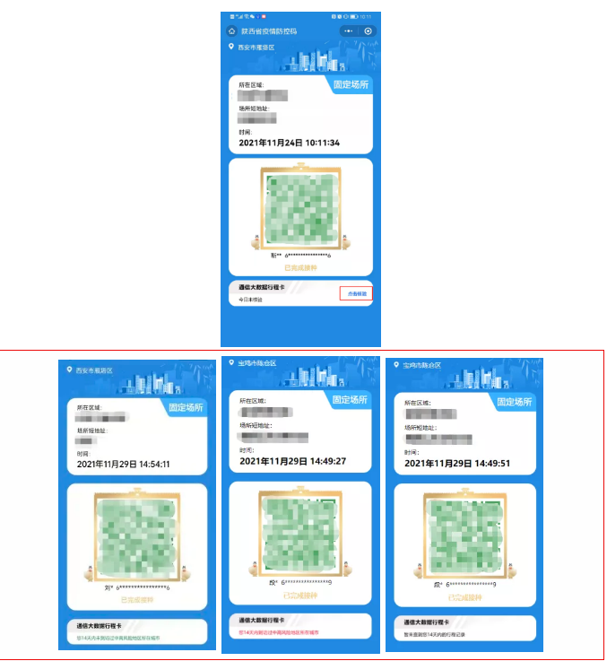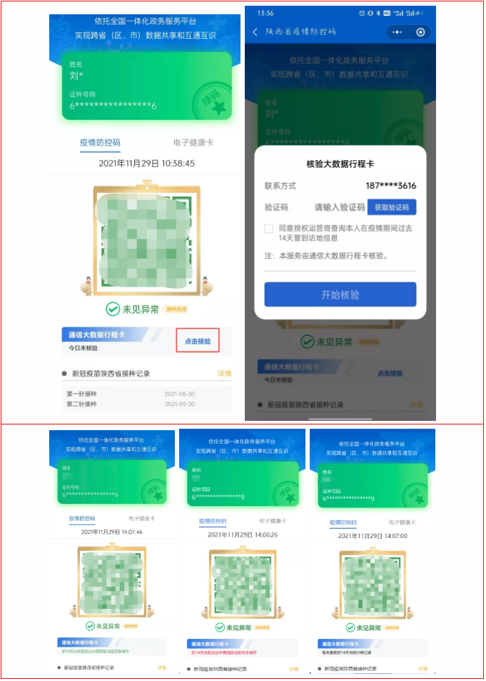居民可在微信或支付寶中打開陜西健康碼小程序的“我的防控碼”界面,就能看到在防控碼下方專有一欄“通信大數(shù)據(jù)行程卡”,“點擊核驗”即可根據(jù)陜西疫情防控碼所綁定手機(jī)號查詢最近14天是否到過中高風(fēng)險地區(qū)。并且疫情防控碼頁面上僅保留當(dāng)日的核驗結(jié)果,如第二天使用需要再次點擊核驗。
