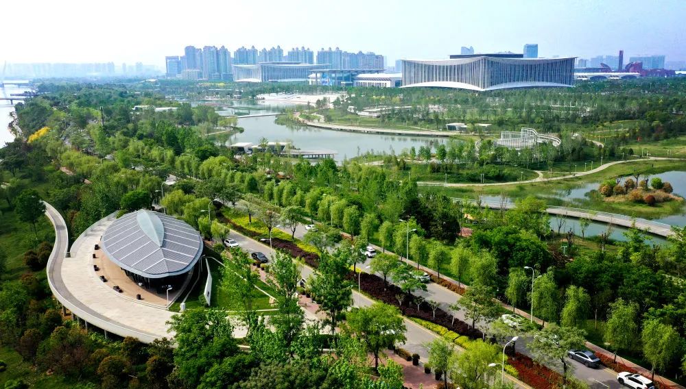 ↑位于西安浐灞生態(tài)區(qū)的西安國(guó)際會(huì)議中心(5月1日攝,無(wú)人機(jī)照片)。新華社記者 劉瀟 攝