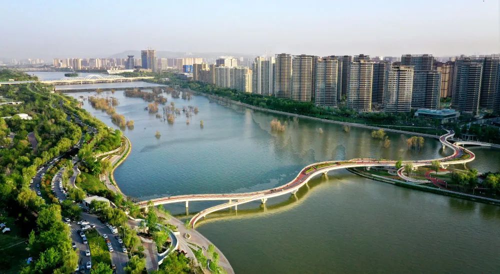 ↑位于西安浐灞生態(tài)區(qū)的灞河兩岸景色(4月16日攝,無(wú)人機(jī)照片)。新華社記者 劉瀟 攝