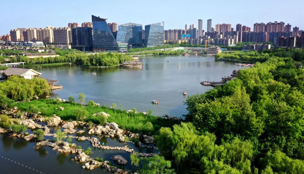 ↑西安曲江南湖(4月25日攝,無(wú)人機(jī)照片)。新華社記者 劉瀟 攝