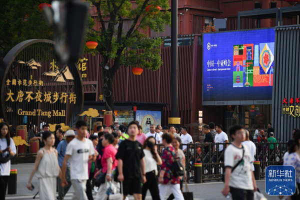 ↑這是5月15日拍攝的西安市雁塔區(qū)一處商場外的中國-中亞峰會宣傳海報。新華社記者 張博文 攝