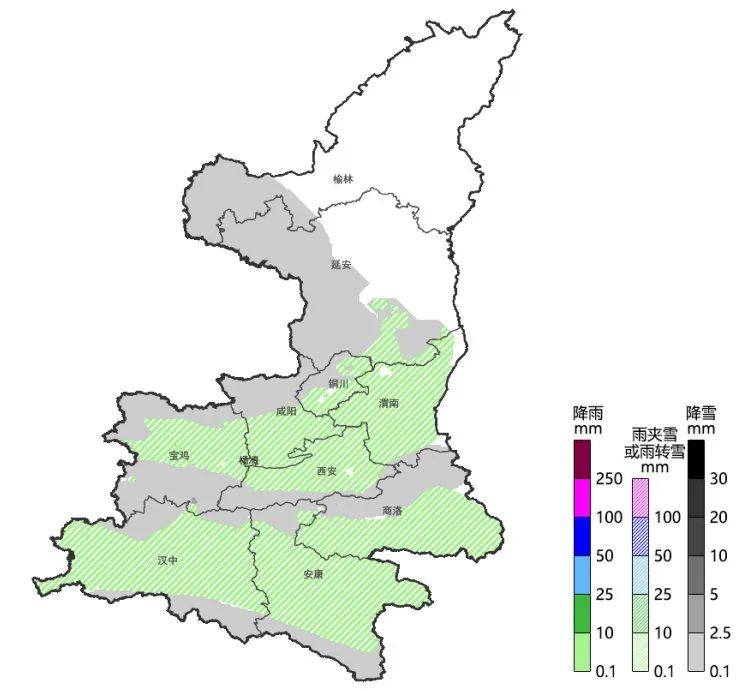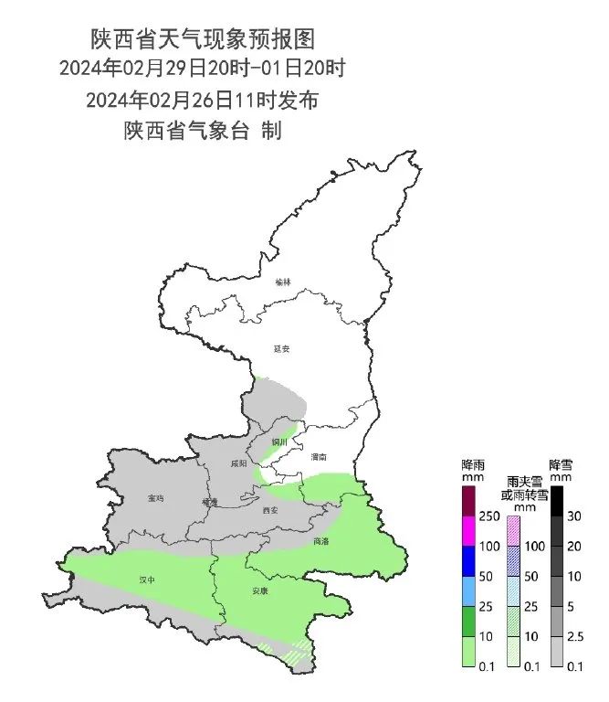 02月28日20時-02月29日20時:全省陰天,陜北南部、關(guān)中大部、商洛及秦巴山區(qū)有小雪或雨夾雪(0.1-3.0mm);漢中、安康有小雨或雨夾雪(0.1-2.0mm),陜北北部有4級左右偏北風,日平均氣溫陜北北部下降4℃左右。