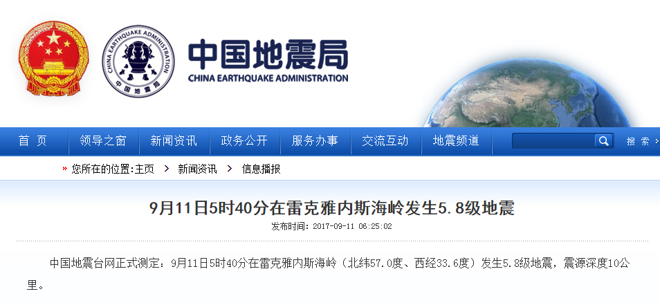 北大西洋雷克雅內(nèi)斯海嶺發(fā)生5.8級(jí)地震 震源深度10公里
