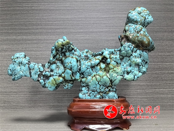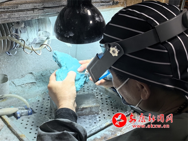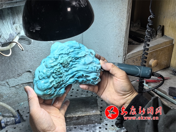 中國(guó)寶石琢玉藝術(shù)家徐安對(duì)白河綠松石進(jìn)行雕刻
