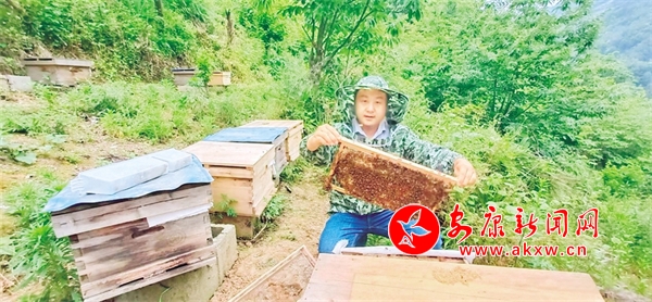 2016年,江鑫養(yǎng)了3箱蜜蜂,但由于經(jīng)驗不足,3箱蜜蜂飛跑了2箱,于是江鑫就按照河南夫妻的經(jīng)驗細心養(yǎng)殖,小心呵護,2017年由1箱蜜蜂繁殖發(fā)展到50多箱蜜蜂,在黃泥村“兩委”的支持下他還成立了養(yǎng)蜂合作社。2018年,又繁殖發(fā)展40箱蜜蜂,在漢濱區(qū)文化和旅游廣電局的幫扶指導下,江鑫同時享受了漢濱區(qū)扶貧政策的獎勵扶持資金8000元,當年賣出蜂蜜200多公斤,價格200元一公斤;2019年又發(fā)展200多箱蜜蜂,當年賣出了500多公斤蜂蜜,收入10多萬元,他自己也成了養(yǎng)蜂“土專家”,很多當?shù)乩习傩障蛩麑W習養(yǎng)蜜蜂的技術,他毫不保留地傳授養(yǎng)蜂技術,還給他們提供中華蜂種、蜂箱,幫助他們在網(wǎng)上銷售蜂蜜。目前,江鑫已經(jīng)帶動30多戶群眾一起發(fā)展“甜蜜”事業(yè)。