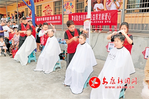 現(xiàn)場(chǎng),通過(guò)有獎(jiǎng)問(wèn)答、發(fā)放宣傳資料、設(shè)立咨詢(xún)臺(tái)等形式,向村民進(jìn)行平安建設(shè)、普法、反詐等宣傳。來(lái)自漢濱區(qū)陽(yáng)光愛(ài)心護(hù)理院的志愿者們?yōu)槔先藗兲峁┙】抵笇?dǎo)。愛(ài)心人士龔甲超組織的義剪活動(dòng)也受到了老人們的歡迎,志愿者們免費(fèi)為現(xiàn)場(chǎng)50多名老人理發(fā)。書(shū)法家們現(xiàn)場(chǎng)圍繞“孝義”主題進(jìn)行創(chuàng)作,并贈(zèng)送給群眾。演出結(jié)束后,近百名老人到社區(qū)的孝義食堂參觀和免費(fèi)用餐。