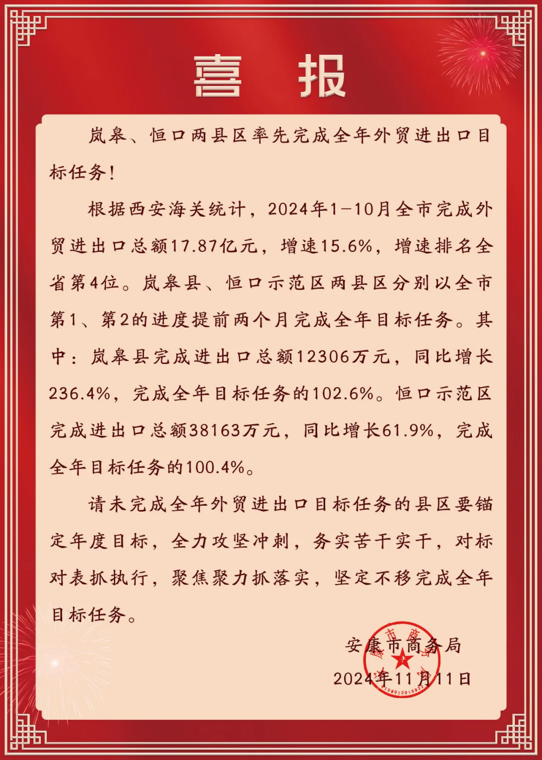 近日,市商務(wù)局發(fā)來喜報(bào),恒口示范區(qū)率先完成全年外貿(mào)進(jìn)出口目標(biāo)任務(wù)。