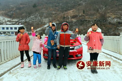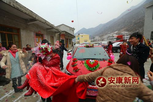 天空飄著雪花,迎親車隊緩緩前行,短短了2公里行程,走了20分鐘,中途不時有孩子們擋著喜車,問新娘子討要紅包和喜糖。車隊進入朱家咀村頭,早早等待在那里的孩子就前去報信,邊跑邊喊:新娘子來了!6uF安康新聞網(wǎng)