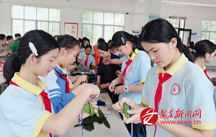 活動(dòng)現(xiàn)場(chǎng),老師與家長(zhǎng)手把手向?qū)W生傳授包粽技巧,從粽葉的折疊角度、糯米的填充分量,到捆扎成形的精細(xì)手法,學(xué)生們圍坐桌前專(zhuān)注練習(xí)。折葉、填米、捆扎……轉(zhuǎn)眼間一個(gè)棱角分明的粽子便成型,現(xiàn)場(chǎng)粽葉翻飛、笑語(yǔ)不斷;顒(dòng)中,老師們還穿插講解端午習(xí)俗,當(dāng)熱氣騰騰的粽子出鍋時(shí),孩子們捧著軟糯香甜的粽子細(xì)細(xì)品嘗,在味蕾的享受中感悟傳統(tǒng)文化的深厚底蘊(yùn)。