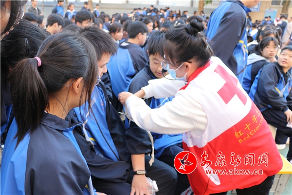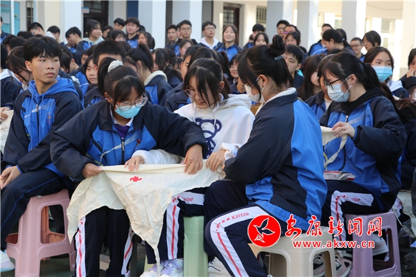 活動中,縣紅十字會工作人員向?qū)W生發(fā)放了三角巾,現(xiàn)場向?qū)W生講解了三角巾的結(jié)構(gòu)和各部分的功能,并以手臂、肩部和胸部三個部位受傷為例做了操作示范,手把手地指導(dǎo)學(xué)生如何包扎、如何敷料、如何固定、如何打結(jié)。同學(xué)們邊觀察邊實操,不時和工作人員進行互動,尋求專業(yè)指導(dǎo),親手體驗三角巾包扎的操作流程,在鍛煉動手實踐能力的同時,掌握身體受傷的應(yīng)急處理技能,增強應(yīng)對突發(fā)事件的自護自救和科學(xué)救護能力。