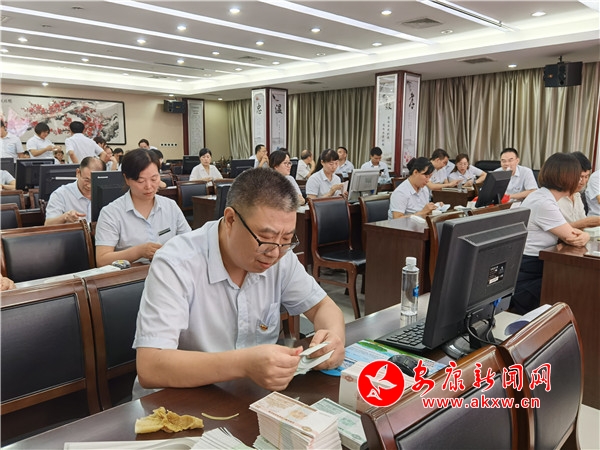 據(jù)了解,此次比賽設置了翻打百張傳票、字符錄入和手工點鈔、業(yè)務知識競賽四個項目。在翻打百張傳票和漢字錄入環(huán)節(jié),選手們靈巧的雙手在計算器和鍵盤上游走,伴隨著“噼里啪啦”敲擊聲,只見一個個數(shù)字答案輸入考試系統(tǒng),一行行字符在電腦屏幕上快速跳動。在點鈔比賽中,選手們單指單張、多指多張等多種點鈔手法各顯風采,清點、墩齊、扎把、蓋章,每個步驟都環(huán)環(huán)相扣,一絲不茍,嫻熟的手法讓人目不暇接,印象深刻。