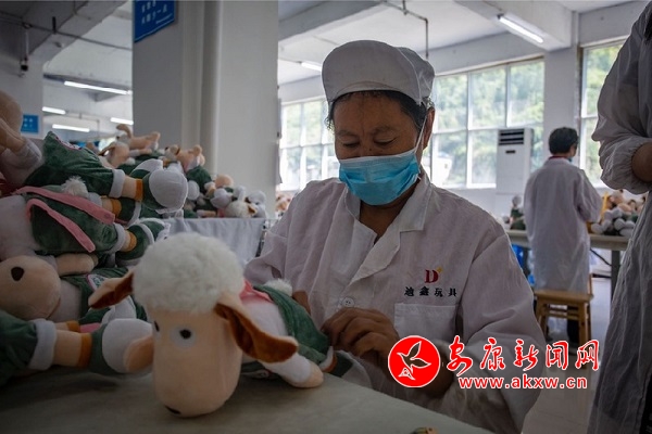 在毛壩鎮(zhèn),像杜孝彩一樣在家門口上班的人還有很多,這是怎么一回事兒呢?原來這都得益于社區(qū)玩具工廠。當天紫陽走訪的第一站,記者就來到迪鑫玩具工廠,縫紉車間、手工車間……車間里的工人都是當?shù)卮迕,他們嫻熟地操作,一件件毛絨玩具在這里生產(chǎn)出來,銷往全球。