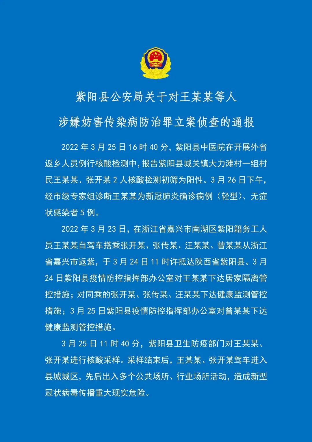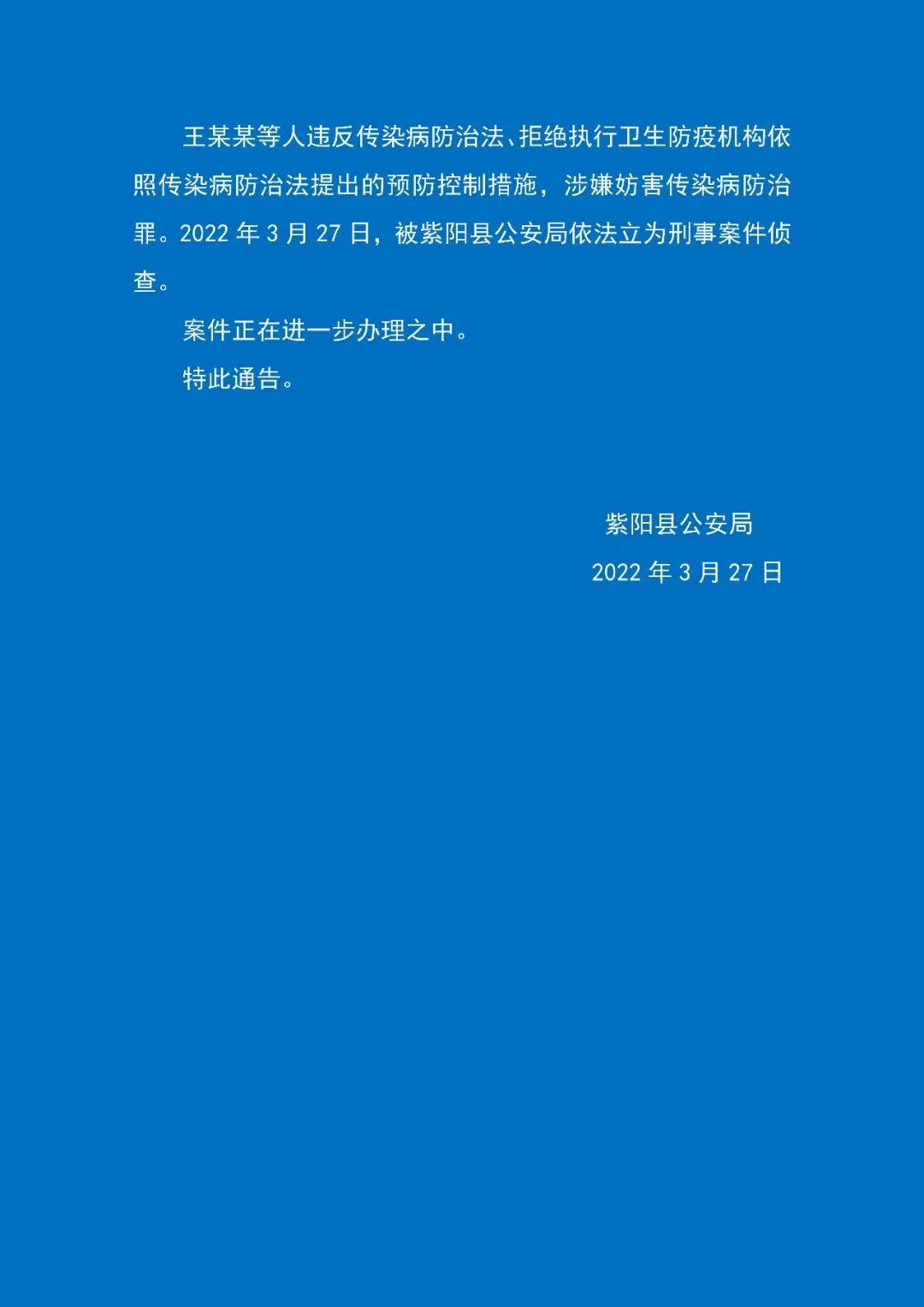 紫陽縣公安局關(guān)于對王某某等人涉嫌妨害傳染病防治罪立案偵查的通報