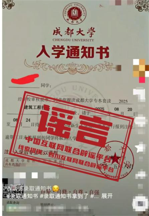 教育部多次提醒,部分機構(gòu)和個人打著普通高等學歷教育幌子,實際卻為自考助學、網(wǎng)絡(luò)教育等其他教育形式,或進行虛假宣傳。如未通過高考招生錄取獲得正式通知書,無法注冊普通高校正式學籍,也無法取得普通高等學校學歷證書。考生及家長應(yīng)通過正規(guī)渠道核驗錄取信息,嚴格保護個人信息,防止被不法分子利用。(來源:四川互聯(lián)網(wǎng)舉報辟謠平臺、成都網(wǎng)絡(luò)辟謠)