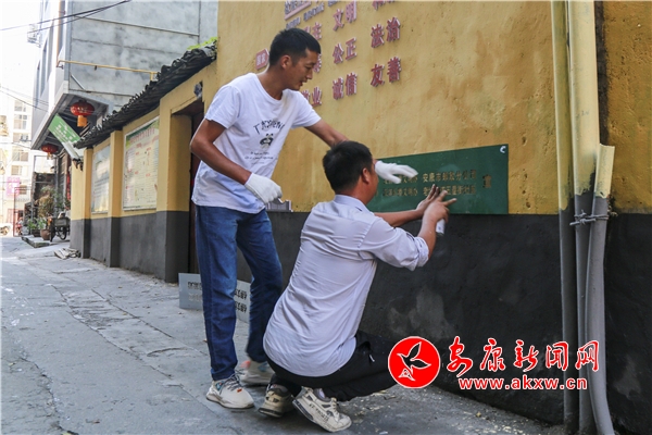 7月21日, 城區(qū)五星街社區(qū)組織人員,對五星街的背街小巷進行清理,粉刷墻面,書寫標(biāo)語。(李春江)