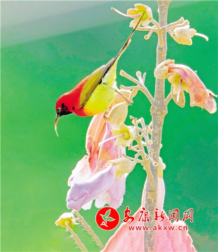 桐花鳳,是經(jīng)常出現(xiàn)在古代文人墨客筆下的吉祥鳥。但因很多人從未見過桐花鳳,遂將桐花鳳與綠毛幺鳳等混淆起來。經(jīng)今人翔實(shí)考證,才證實(shí)古“桐花鳳”就是現(xiàn)今的“太陽鳥”。太陽鳥象征著祥瑞、吉祥和諧、鳳凰齊飛、太陽重升、身化火焰而使人間恢復(fù)光明。它還是熱愛光明、追求光明、獻(xiàn)身光明的象征。太陽鳥也是太陽崇拜和鳥崇拜相結(jié)合的產(chǎn)物。太陽鳥世界共有14種,中國有6種,被譽(yù)為“東方的蜂鳥”“月下老人”,再加上太陽鳥的寓意如此之好,太陽鳥一直受到人們的喜愛與青睞。(圖文 張東風(fēng) )