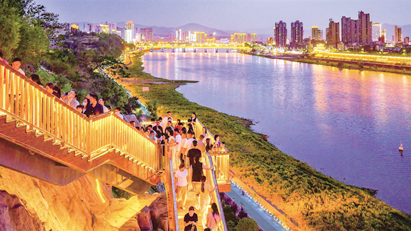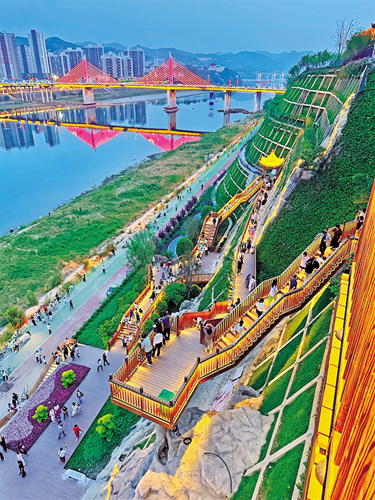 觀瀾亭飛檐斗拱,站在這里可西望月河匯漢江、東瞰碧水穿城過;覽江云臺(tái)以鋼結(jié)構(gòu)懸挑凌空18.5米,形成“云端透視”觀江視角;花瀑疊翠垂直落差30米,杜鵑映崖、霧森彌漫,宛如仙境;望川臺(tái)將原始排水溝改造成“人工天成”的塑石景觀,周邊景色盡收眼底。