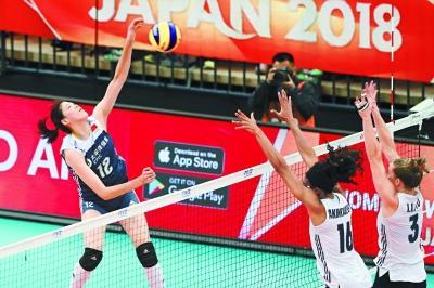 李盈瑩(左)在比賽中扣球。 新華社發(fā) 本報(bào)名古屋電(京報(bào)體育記者 孔寧)昨天下午,2018年女排世錦賽六強(qiáng)決戰(zhàn)首回合在日本名古屋綜合體育館打響,中國女排在大……