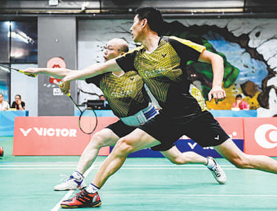 | 男子C組(50歲以上)雙打決賽北京隊(duì)選手母利恩(右)、郭曉宏在比賽中。 |