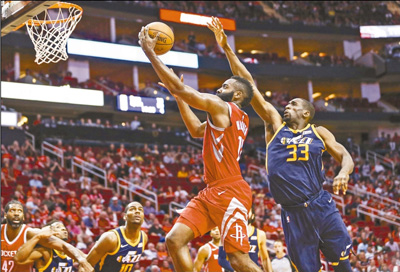 當(dāng)?shù)貢r(shí)間11月5日,火箭隊(duì)球員哈登(上左)在比賽中突破上籃。當(dāng)日,在2017—2018賽季美國男籃職業(yè)聯(lián)賽(NBA)常規(guī)賽中,休斯敦火箭隊(duì)主場(chǎng)以137∶110戰(zhàn)勝猶他爵士隊(duì),收獲三連勝,哈登全場(chǎng)25投19中,罰球12罰11中,拿下56分13次助攻,創(chuàng)造個(gè)人得分新高,56分也是火箭隊(duì)歷史上的第二高分;效力于火箭隊(duì)的中國球員周琦連續(xù)第三場(chǎng)比賽替補(bǔ)上場(chǎng),貢獻(xiàn)4分和1個(gè)籃板。