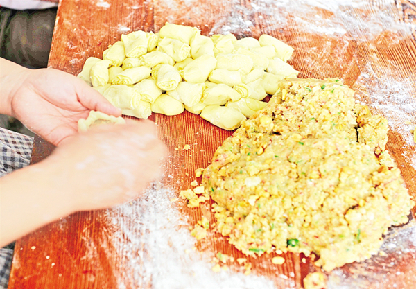 制皮、制餡、制酥、包酥、成型、蓋章、扎眼……四個(gè)人在操作時(shí)不言不語(yǔ),只顧埋頭做活!