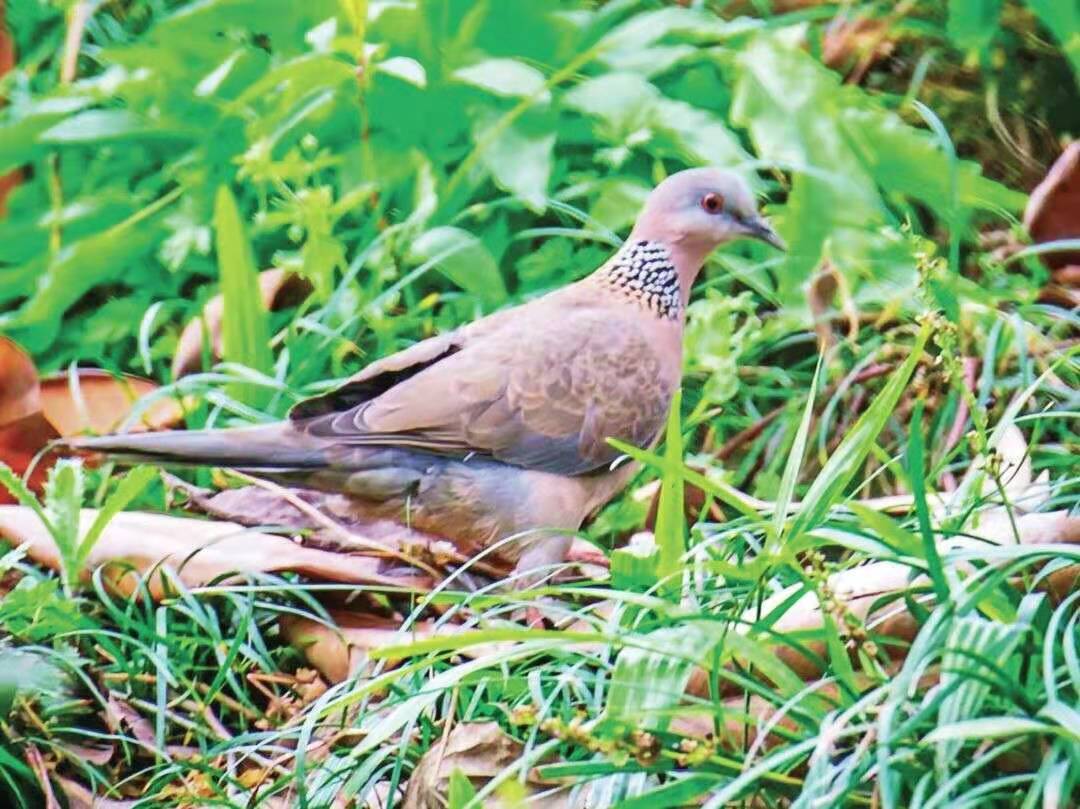 珠頸斑鳩也是很少到地面上來,只有無人時,會笨拙地飛到在地面上叨食。它們常藏在樹枝間,看不到身影,但會發(fā)出“咕咕”的聲音,表明自己的存在。