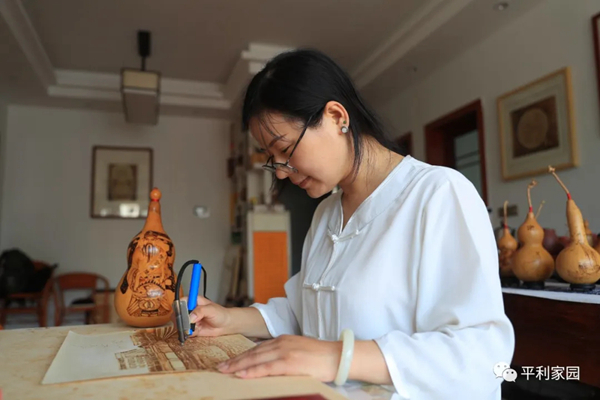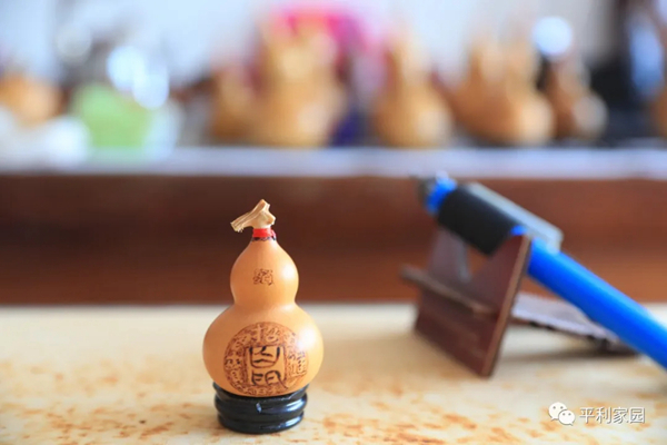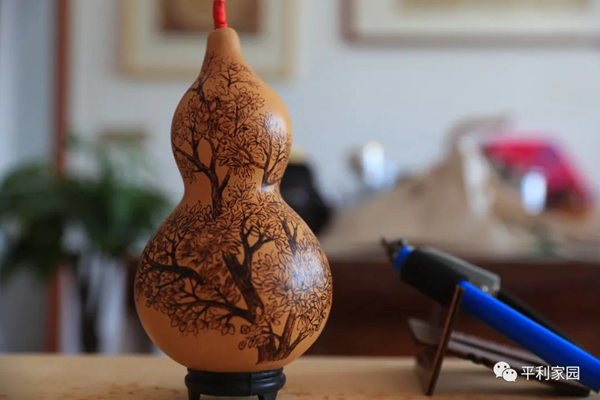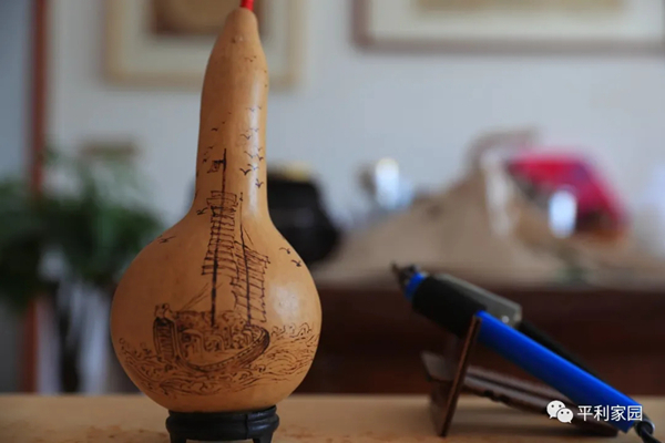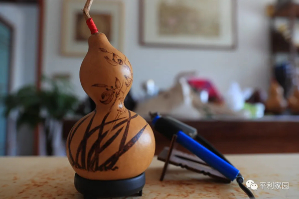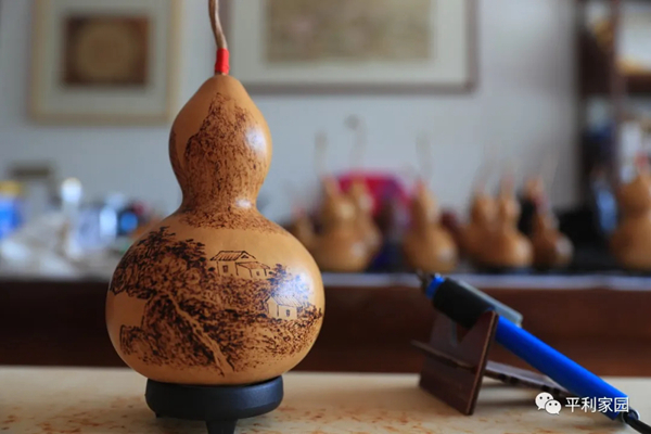 一組葫蘆,明黃里透出古色,熠熠生輝的畫幅里,平利雄山秀水滴滴溢出,一時間,香氣四溢,鄉(xiāng)風彌漫,整個房間便裝滿女媧故里平利的山山壑壑。