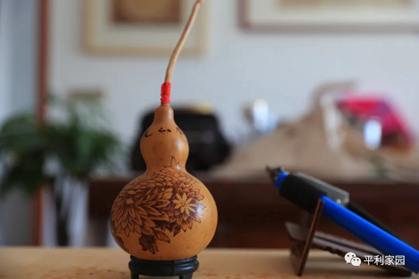 一組葫蘆,一組小物件。上面的畫,全是腦海中的圖案,烙筆一拿,眼睛一閉,線條在流淌,輕勾細挑,提捺頓按,全是走的心靈深處的路徑。