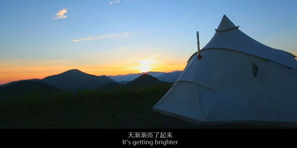 天漸漸亮了起來,越過重重山脈的陽光 映紅了云層,照亮了山谷,催醒了沉睡的動物,一頂頂帳篷像隆起的蘑菇 生⻓在云端之上。