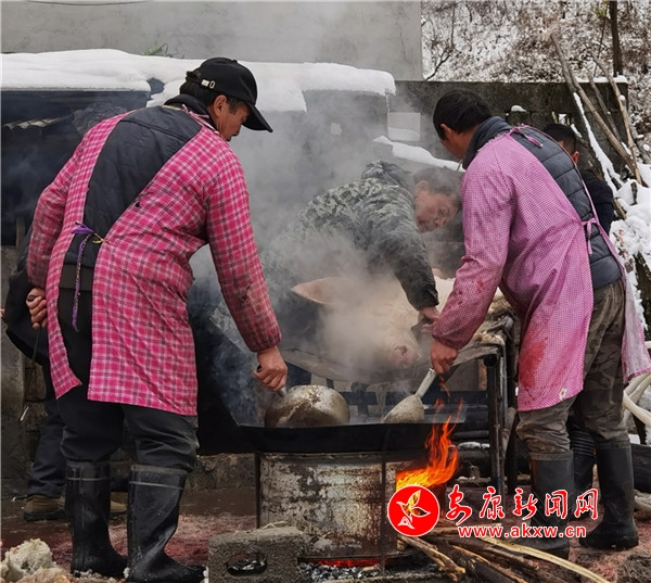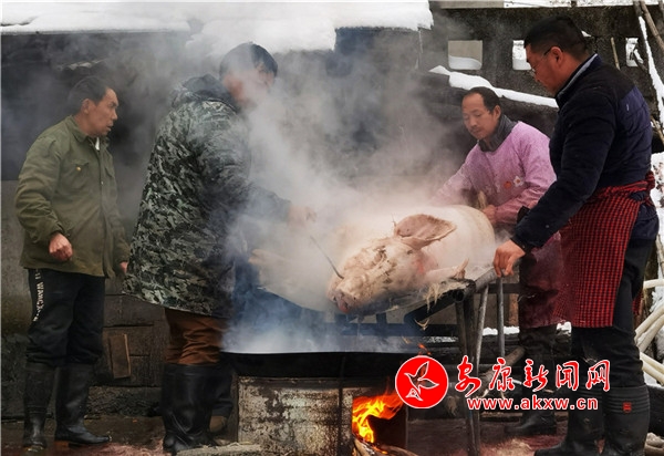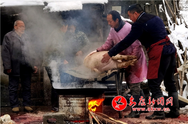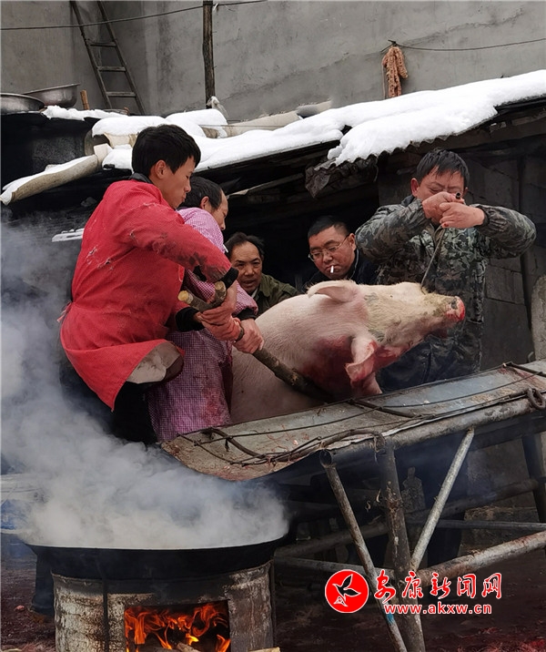 時逢陰歷十月初九,鎮(zhèn)坪縣迎來了入冬以來第一場降雪。漫天大雪,給原本氣溫偏低的化龍山腳下的張家坪增添了寒冷。然而,上竹鎮(zhèn)化龍村8組村民張成凱和叔叔張秀柱,卻帶著家人熱火朝天地忙著殺豬腌制臘肉,絲毫沒有寒冷的感覺。jEb安康新聞網(wǎng)
